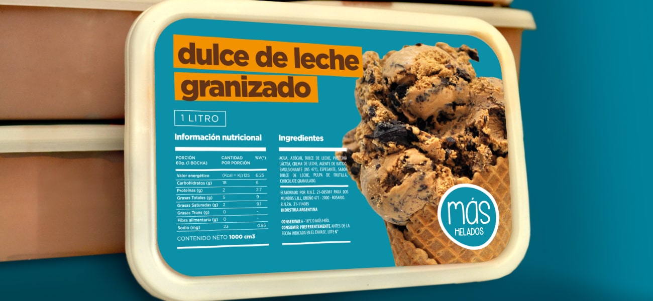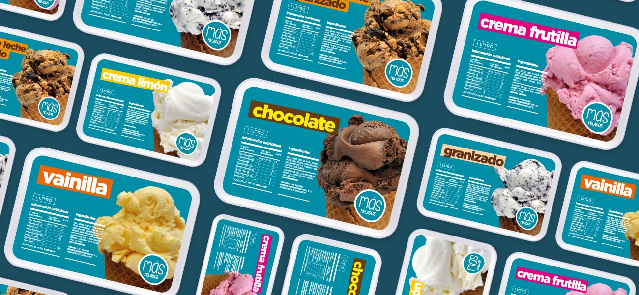 Diseño de etiquetas para envases de la Heladería Más Helados. Se trabajaron en sistema tanto en diseño como en fotografía.